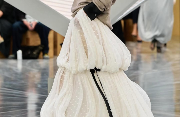 Anderson’s take on the iconic Bar jacket was the opening shot. He shrank it, cropped it, and pushed it into today. It was paired with mini pleated skirts that shouted. The proportions felt youthful, but not gimmicky. The silhouette was still Dior, but with the volume turned way up.