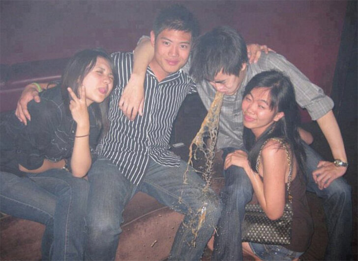 Nothing says a night out like a mix of extremes, and this picture captures it perfectly. While a woman is having a less-than-glamorous time, her vomit is mid-air, and the guy next to her decides it’s the ideal time to flex his biceps.