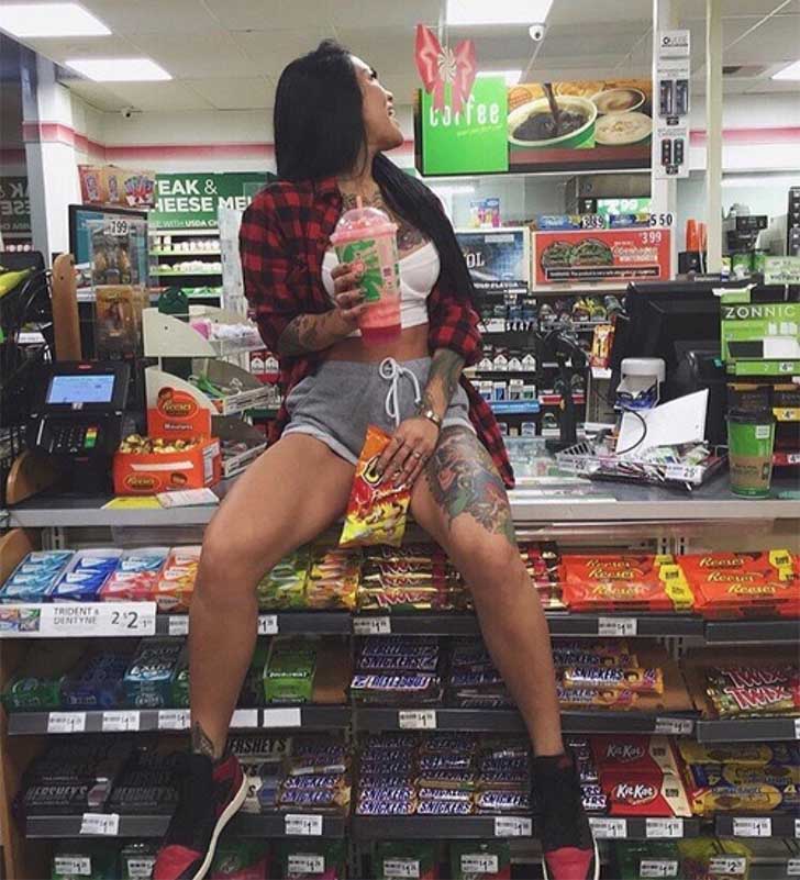 Who said grocery runs can't be glamorous? This brunette makes the snack aisle her runway, serving fierce looks while clutching a Red Bull. It's clear she didn't come to the store for chips alone—she came to own the moment. With that killer outfit and undeniable confidence, she's turning an ordinary errand into something far more exciting.
