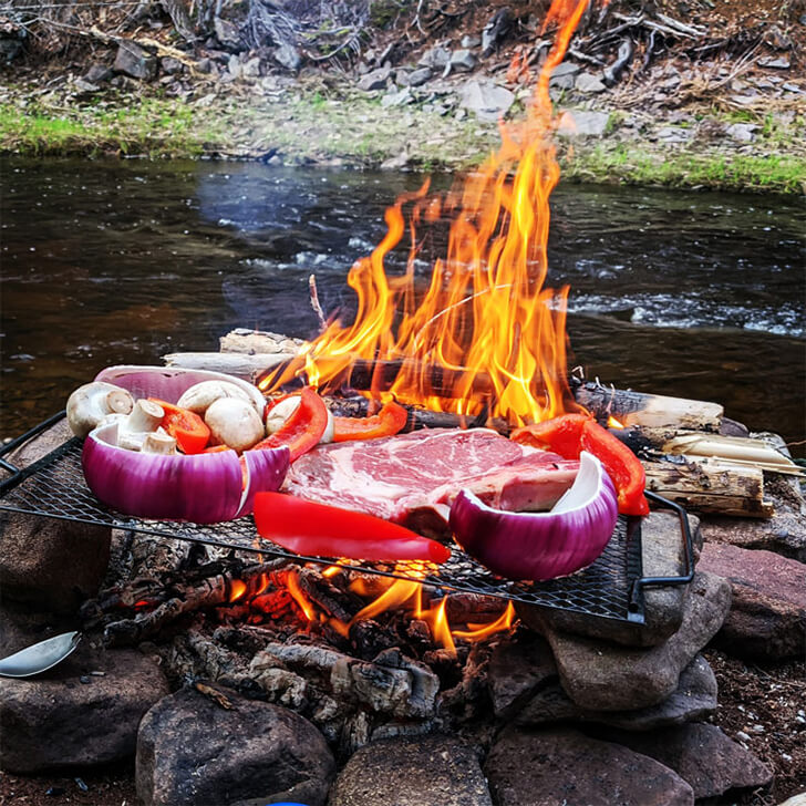 Who knew camping could turn into a five-star grilling experience? This seems like someone got too excited over their "campfire cuisine." They're grilling up a steak, but the fire's more interested in torching the meal than cooking it. Meanwhile, the assortment of vegetables looks like it's about to join the steak in the flames for a dramatic exit.
